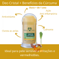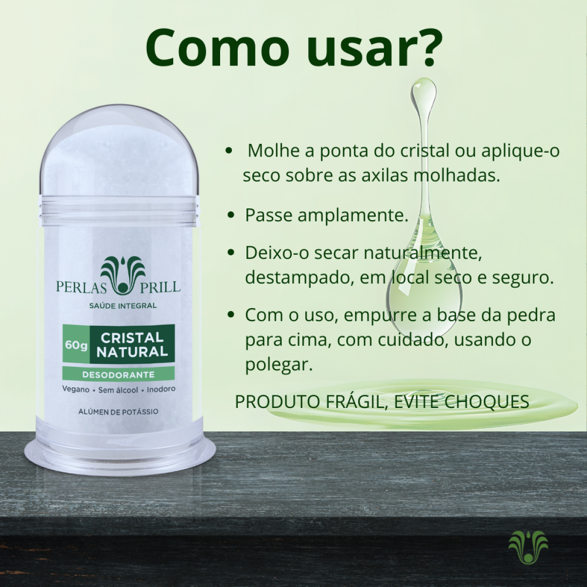MODO DE USO Deve ser usado diariamente sobre a pele limpa e ligeiramente úmida. Deslize o Cristal amplamente nas axilas após o banho,quando suas axilas estão limpas e ainda úmidas. Pode-se também molhar a pedra antes da utilização e deixe secar naturalmente. Você também pode aplicá-lo em outras partes do corpo, mas é interessante ter uma pedra separada para isso a fim de minimizar a propagação de bactérias. O desodorante deve ser guardado destampado em local seco; a tampa é ideal para o transporte do mesmo. Pode-se lavar o cristal com água e sabão caso apresente odor. Exclusivo modelo Push up: À medida em que houver desgaste no tamanho do Cristal, empurre a base do Desodorante para cima, com o polegar. O Cristal vem justo dentro da embalagem, empurre-o com cuidado, prevenindo quedas e choques, produto frágil.