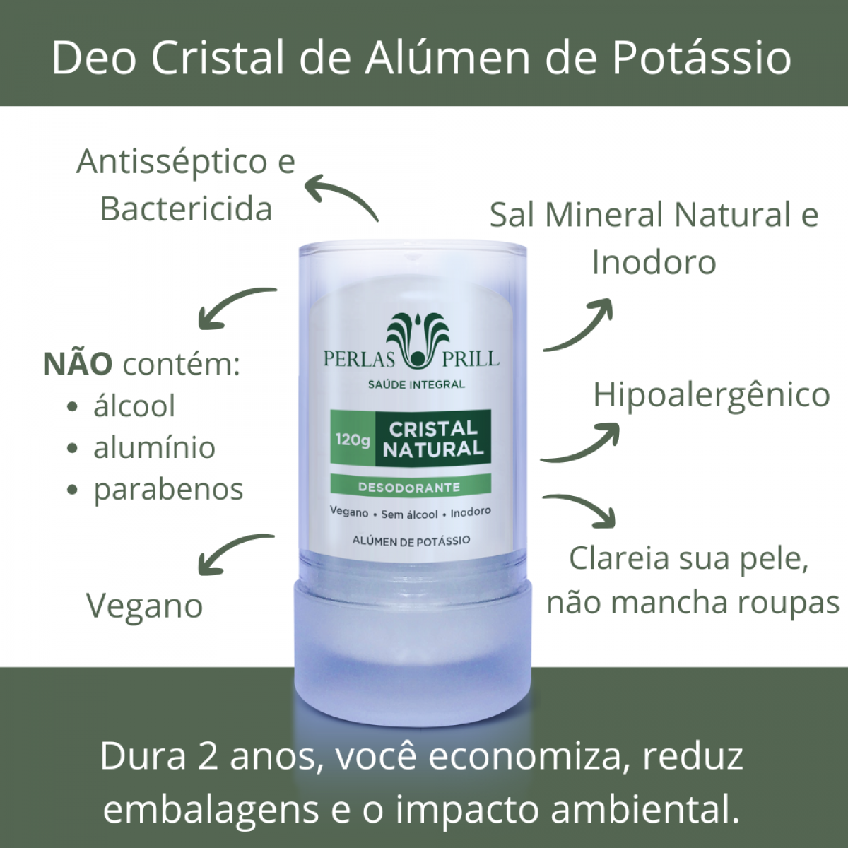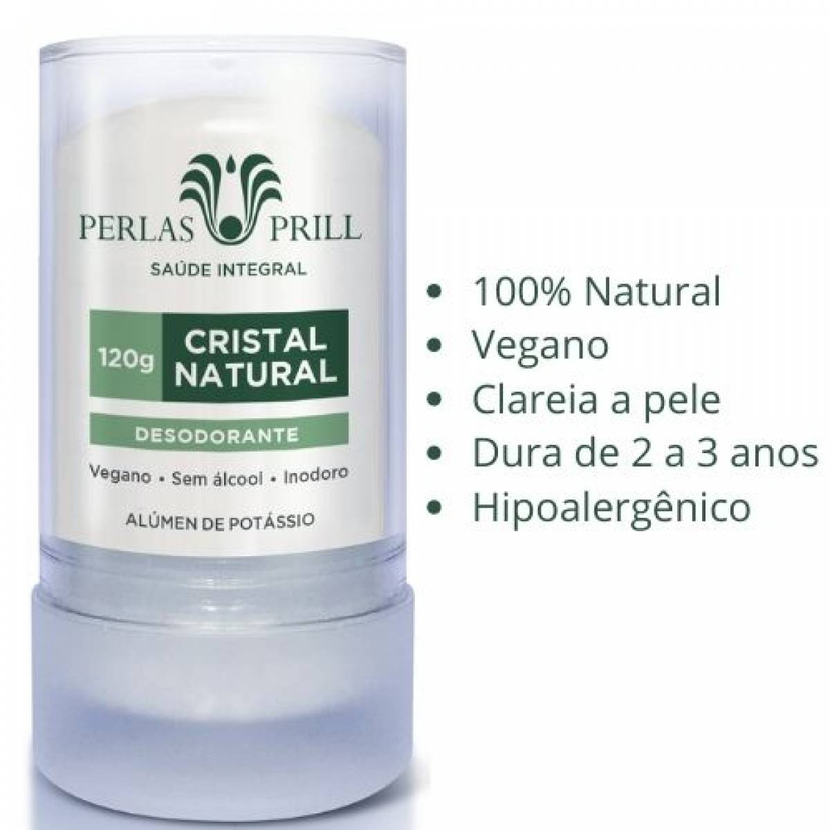 O desodorante cristal natural Perlas Prill é uma alternativa eficaz para quem quer evitar compostos químicos agressivos como cloridrato de alumínio, álcool, triclosan, parabenos, flatatos, sulfatos e perfumes, geralmente presentes nos antitranspirantes e desodorantes comuns.