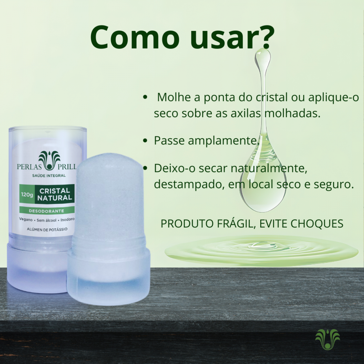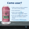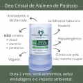 O desodorante deve ser guardado destampado em local seco; a tampa é ideal para o transporte dele. Produto frágil, evite choques. Pode-se lavar o cristal com água e sabão caso apresente odor.